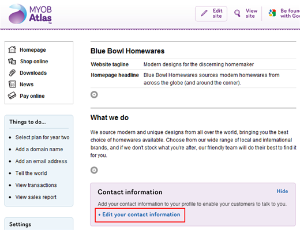 If you want to edit your Account information address (the address that MYOB uses for all correspondence), see Editing your account information. If you want to edit your Find us address (the address that appears on your site in a Google Map), see Displaying your location in a Google Map.