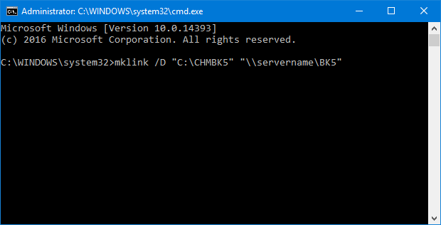 mklink /D “C:\CHMBK5” “\\servername\BK5”- Replace C:\CHMBK5 with a local folder path. This folder should not exist, e.g. C:\CHMBK5 (a folder with this name will be created when you run the command prompt).