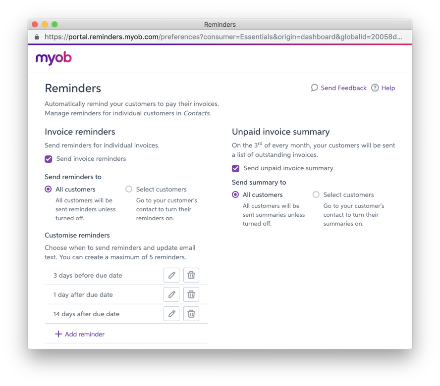 We're keen to hear from you about how we can improve invoice reminders. Just click the feedback link in the Reminders window and tell us what you think.