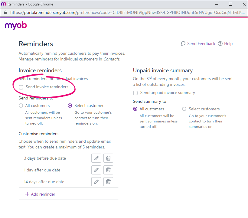 What's the difference? Invoice reminders allow you to choose when you want your customers to receive reminders on individual invoices. Unpaid invoice summaries contain a list of outstanding invoices that a customer will automatically be sent monthly.