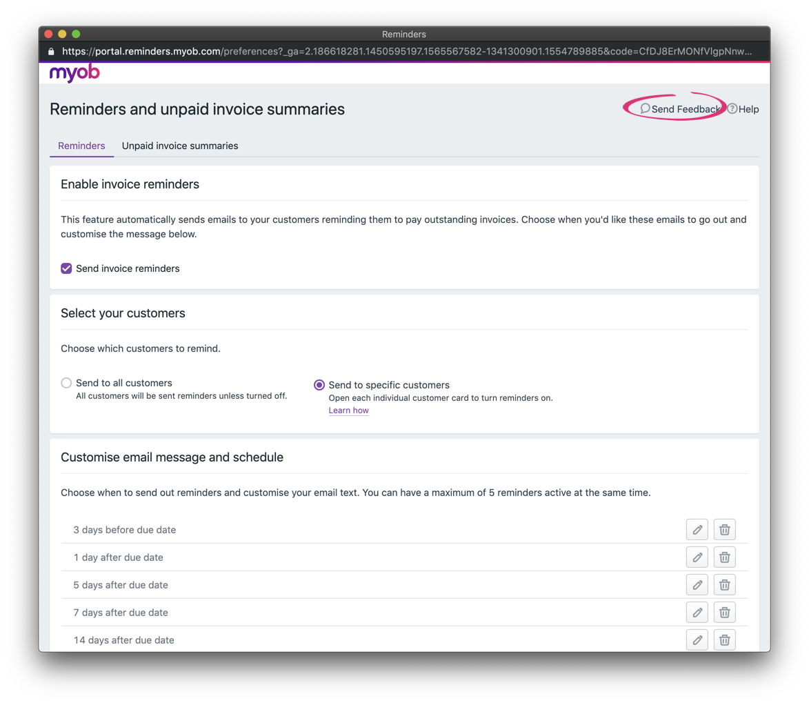 We're keen to hear from you about how we can improve invoice reminders. Just click the feedback link in the Reminders window and tell us what you think.