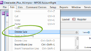 When you delete a transaction, it is permanently removed from your records. How you delete transactions (like sales and purchases) is similar across AccountRight. You open the transaction and select Delete from the Edit menu (you can also right-click in the transaction window to see the edit option).