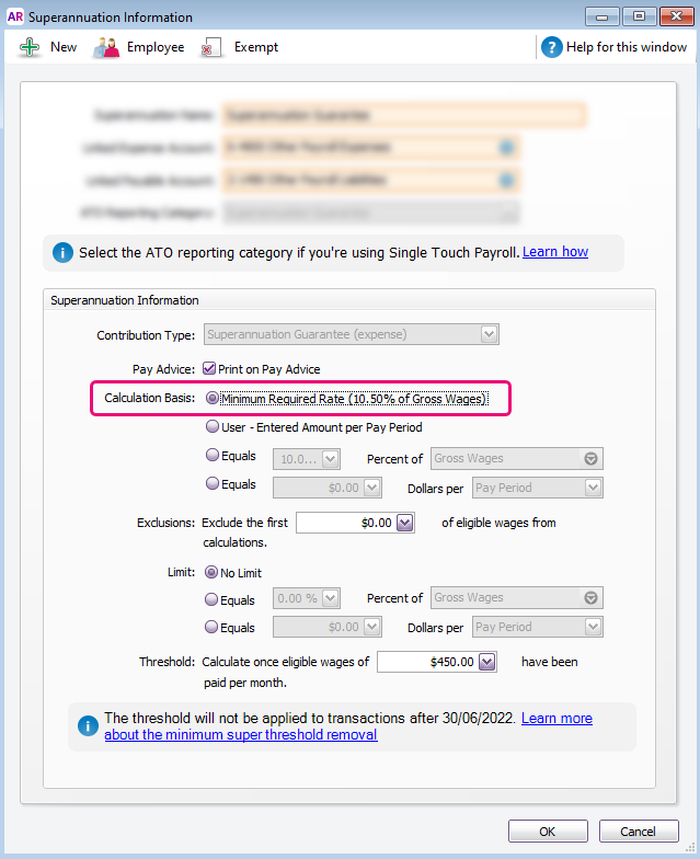 I If this superannuation calculation is only payable if wages exceed a specified amount per month, enter this amount in the Threshold field.