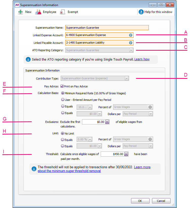 E If you want the superannuation amount accrued to appear on employees’ pay advice, select the Print on Pay Advice option. F Calculation Basis can be: