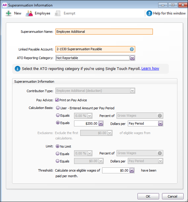 Here's an example where this category has been set up to contribute an extra $200 of super per pay period. If you have other employees requiring different additional super amounts, create a superannuation category for each.