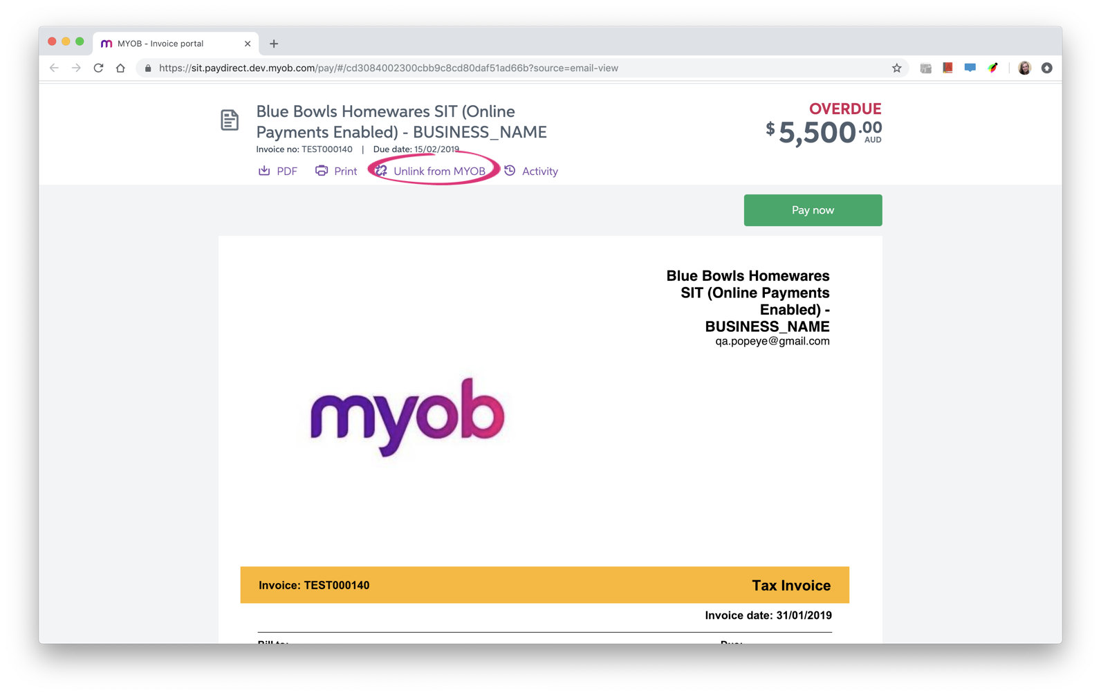 - Unlink to stop Actrol invoices from going to your MYOB account.