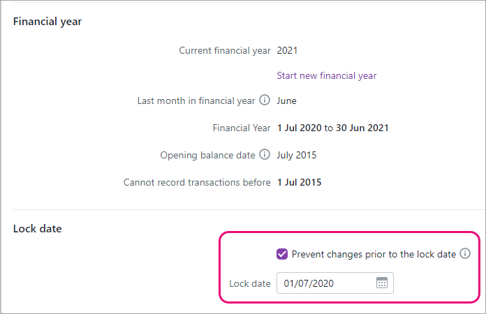 If you have the role of administrator, you can enter a lock date to prevent changes being saved to new or existing transactions prior to this date. You might do this after completing your month-end tasks.