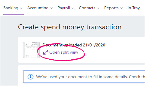 Click Open split view to see the document and the new transaction side-by-side, making it easy to compare.
