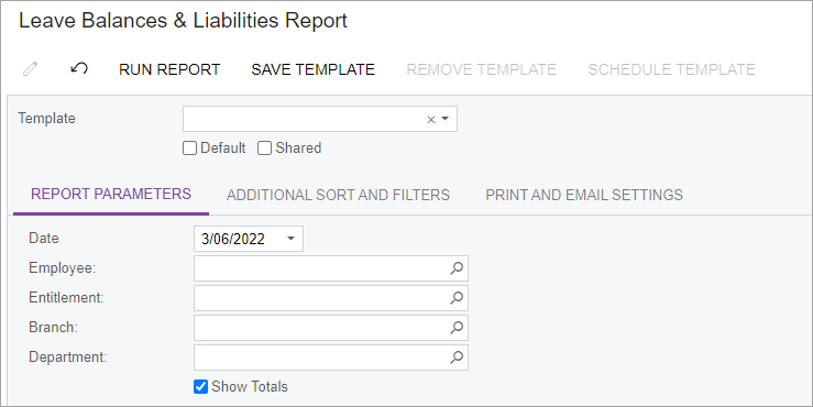 This report lets you check the leave balances and leave liabilities for all active employees, including the leave payment rates for the date you select.
