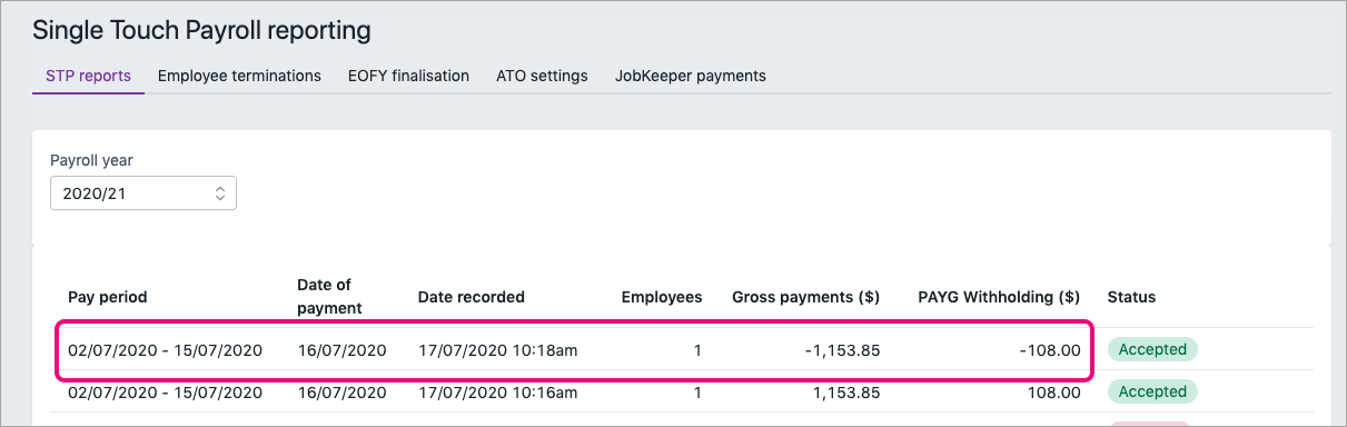 Whether you can delete or reverse a pay is based on its status in the STP Payroll Reporting Centre. This ensures pays which have been accepted by the ATO can't be deleted. Instead, you'll only have the option to reverse the pay then report that reversal to the ATO. Learn more about STP report statuses.