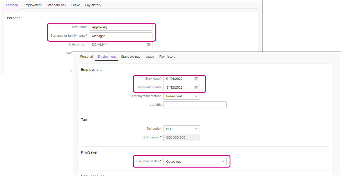 - KiwiSaver status (if you're not actually paying this person as an employee, you can set this to Opted out)